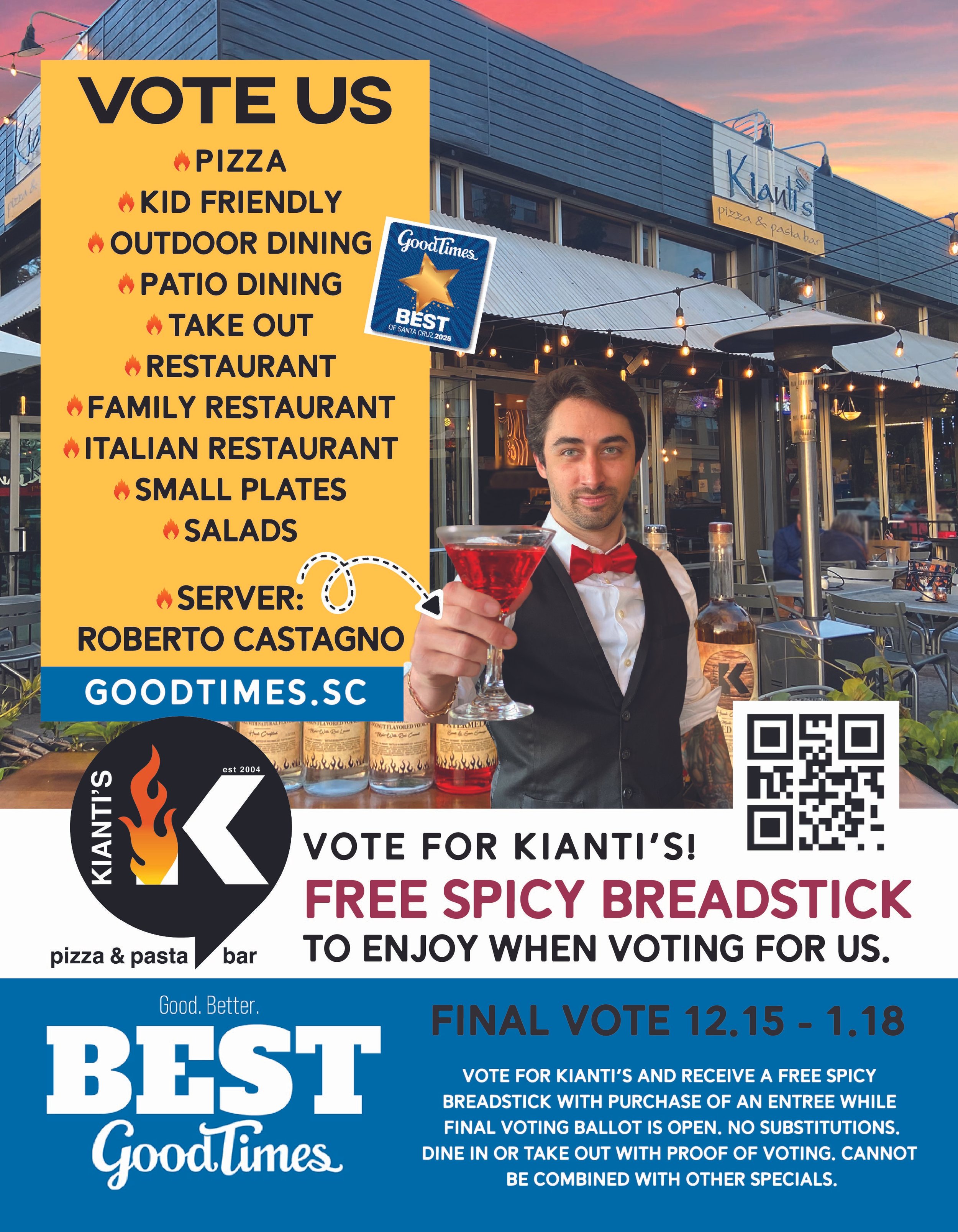 Located in the heart of downtown Santa Cruz, Kianti's Pizza & Pasta Bar stands boldly amongst fellow businesses with its vibrant colors and welcoming atmosphere. The indoor lively and upbeat atmosphere is a crowd pleaser, with weekend performances. For those preferring a more relaxed experience, dine within the heated patios and cozy up to the fireplace or fire tables. Kianti's is a kid friendly restaurant. make your reservation today.